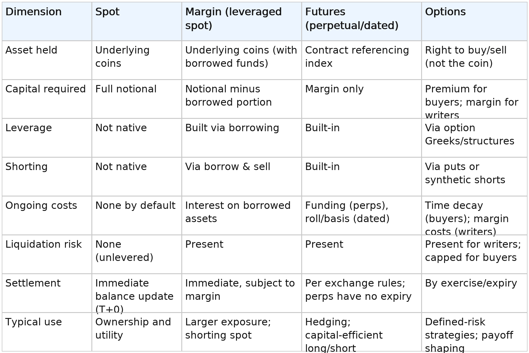 Put together, spot emphasizes simplicity and direct ownership; margin and futures emphasize capital efficiency and flexibility; options emphasize shaping payoff profiles. The best choice depends on whether you prioritize custody and utility of coins, or prefer leveraged instruments with additional costs and responsibilities.