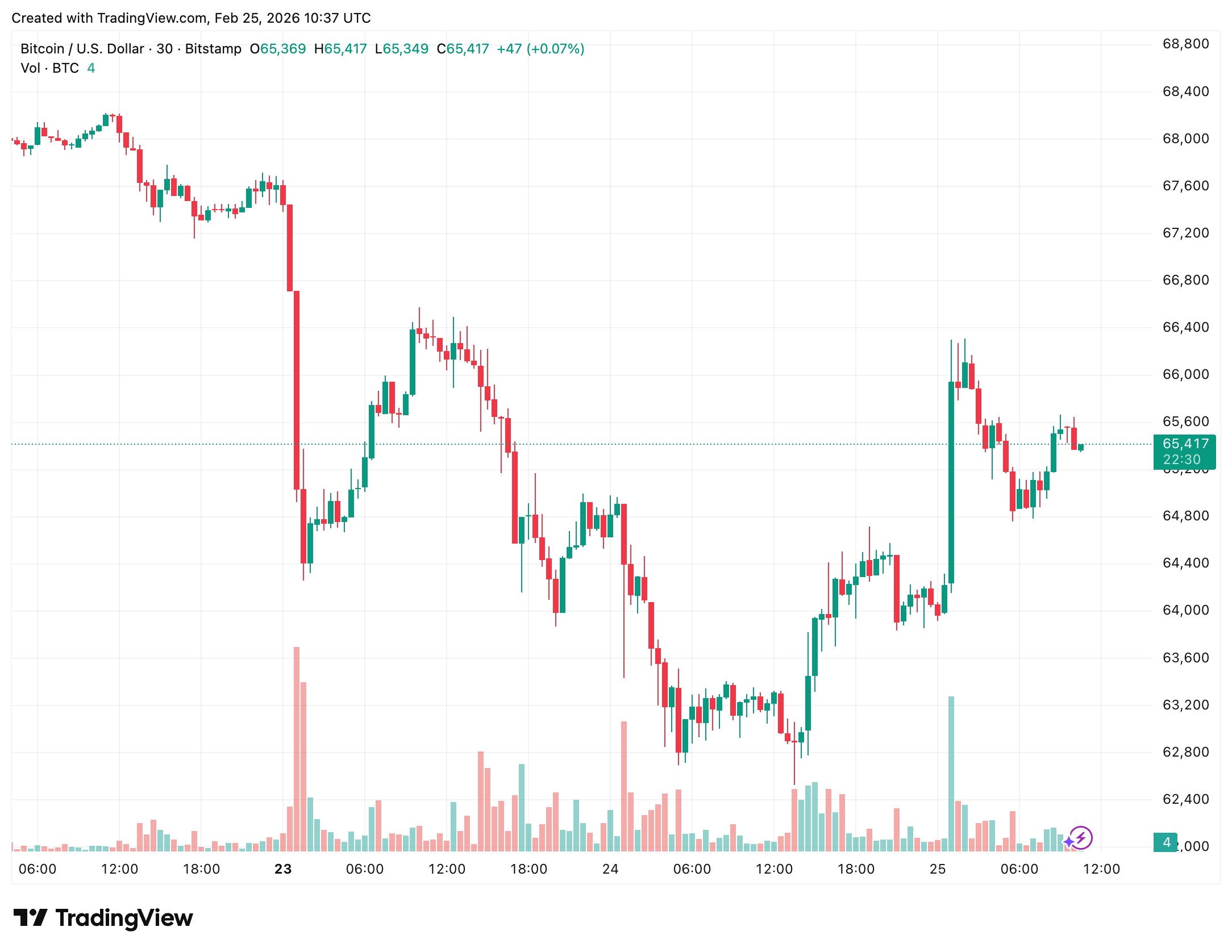 Bitcoin price climbed above $66,000 in early Asian trading on Feb. 25 after a weeks-long slide, then gave back part of the move during U.S. President Donald Trump’s State of the Union address to a joint session of Congress.