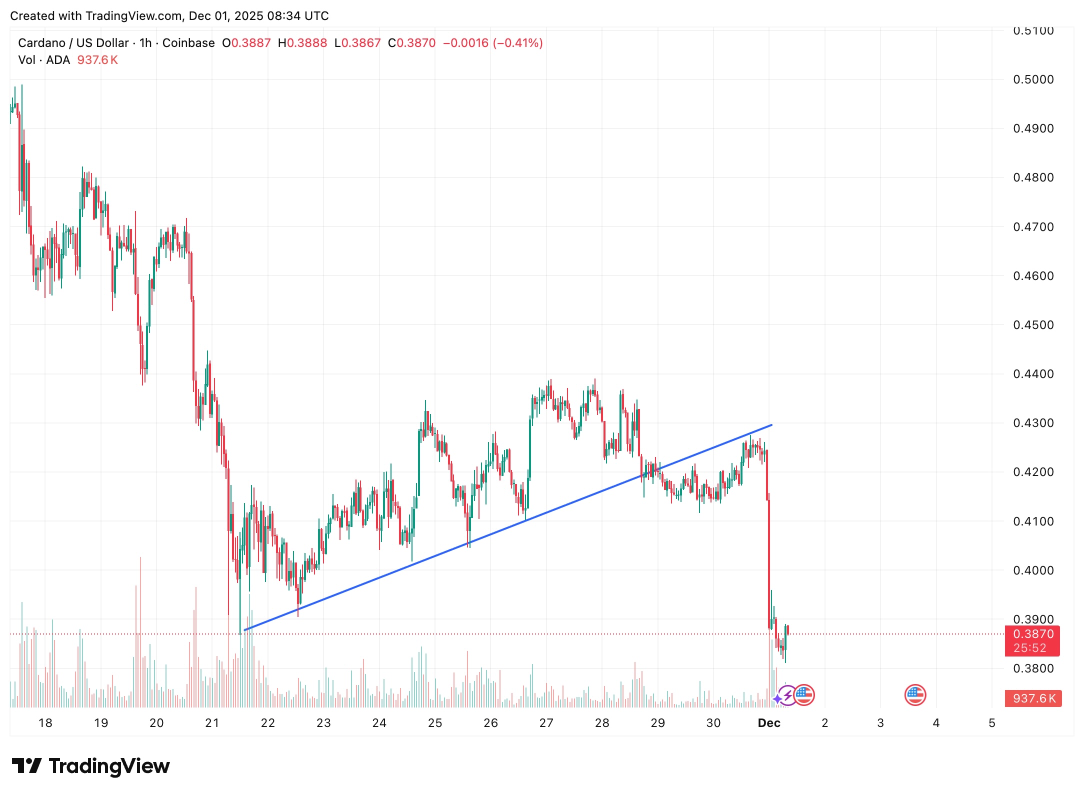 Cardano’s ADA fell to $0.38 after a short mainnet partition on Nov. 21 traced to a faulty delegation transaction. Engineers restored normal operation within hours, yet the token traded near lower levels through the weekend.