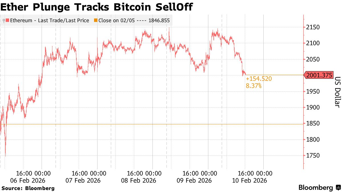 Ethereum accelerated its decline, falling below $2,000 amid deepening risk-off sentiment and a renewed drop in Bitcoin, which again approached $68,000.