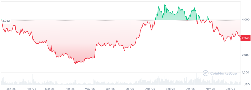 The decline took ETH to an intraday low near $2,895 before stabilizing around $2,948 in recent trading, down more than 6% over 24 hours.