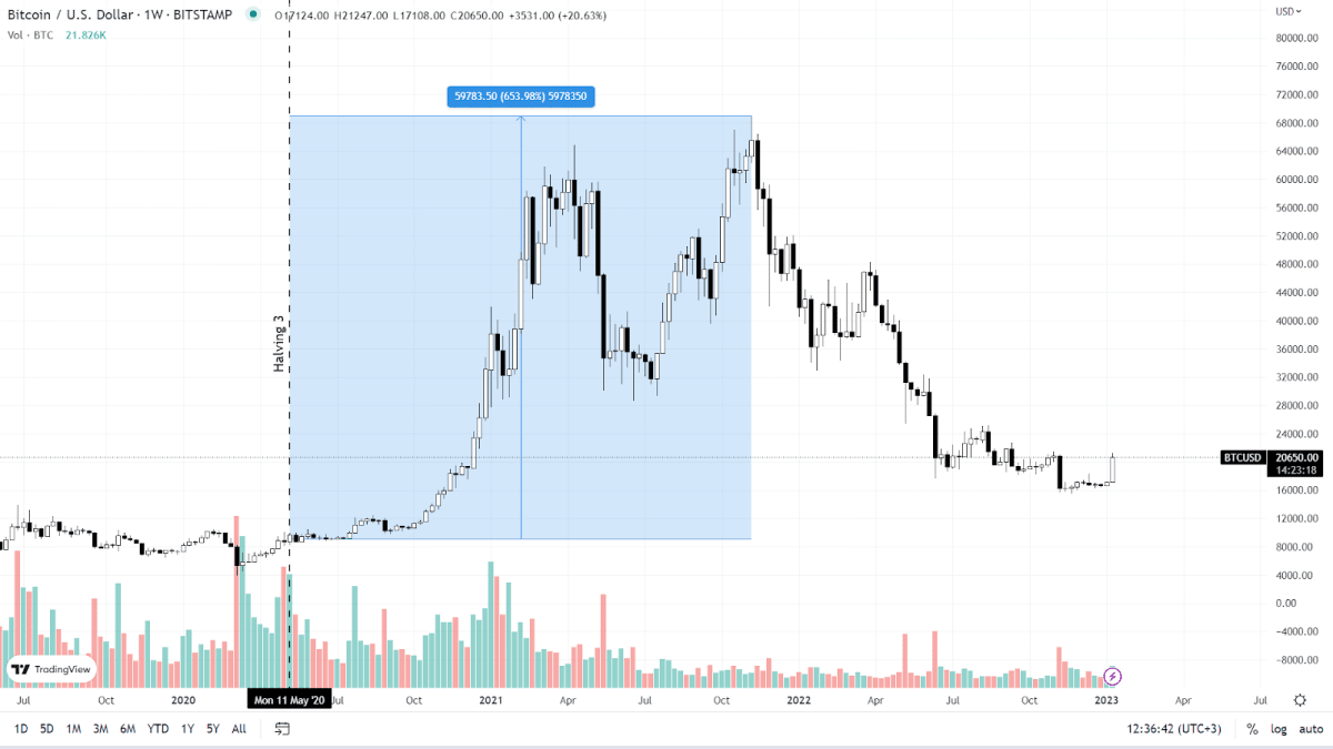 After each halving, within a year or two, there was an explosive increase in the Bitcoin value. The same applies to volatility and trading volumes.
