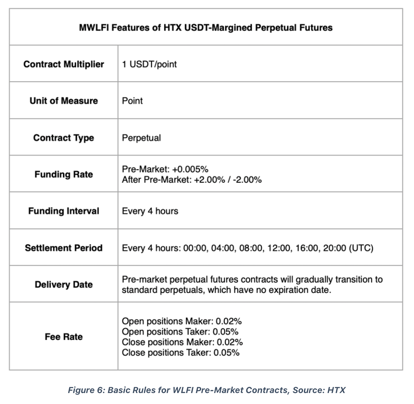 The report notes that activity has expanded beyond OTC and spot formats into derivatives, with pre-market perpetual futures used for price discovery and for expressing directional exposure ahead of listing. HTX cited its WLFI/USDT pre-market perpetual futures as an example of exchange-led pre-issuance trading tied to the WLFI (World Liberty Financial) project.