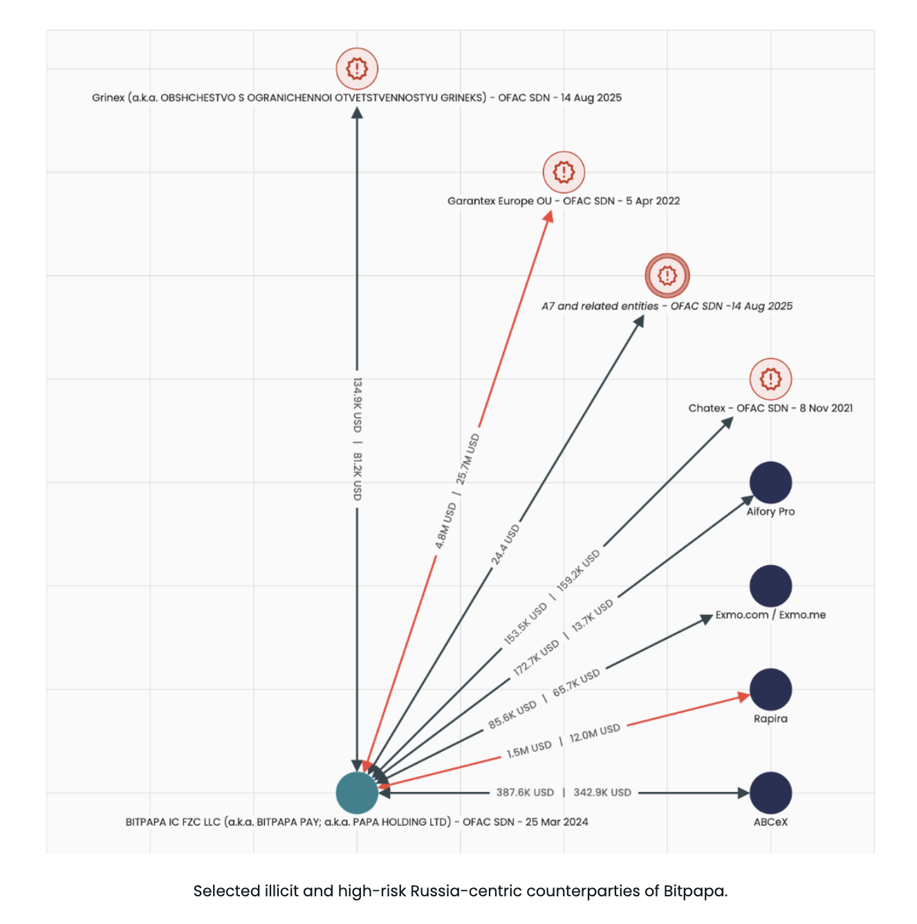 Bitpapa, a peer-to-peer exchange Elliptic said is registered in the UAE but primarily targets Russian users, was the only one of the five platforms that Elliptic noted as already sanctioned by the U.S. Treasury’s Office of Foreign Assets Control (OFAC). Elliptic said Bitpapa’s sanctions-evasion exposure was visible in where funds go next: about 9.7% of its outgoing crypto funds were destined for OFAC-sanctioned targets, including roughly 5% directed specifically to Garantex. Elliptic added that blockchain patterns suggest Bitpapa rotates wallet addresses frequently in a way designed to make it harder for transaction-monitoring systems to identify it as a counterparty and to obscure the Russian origin of funds.
