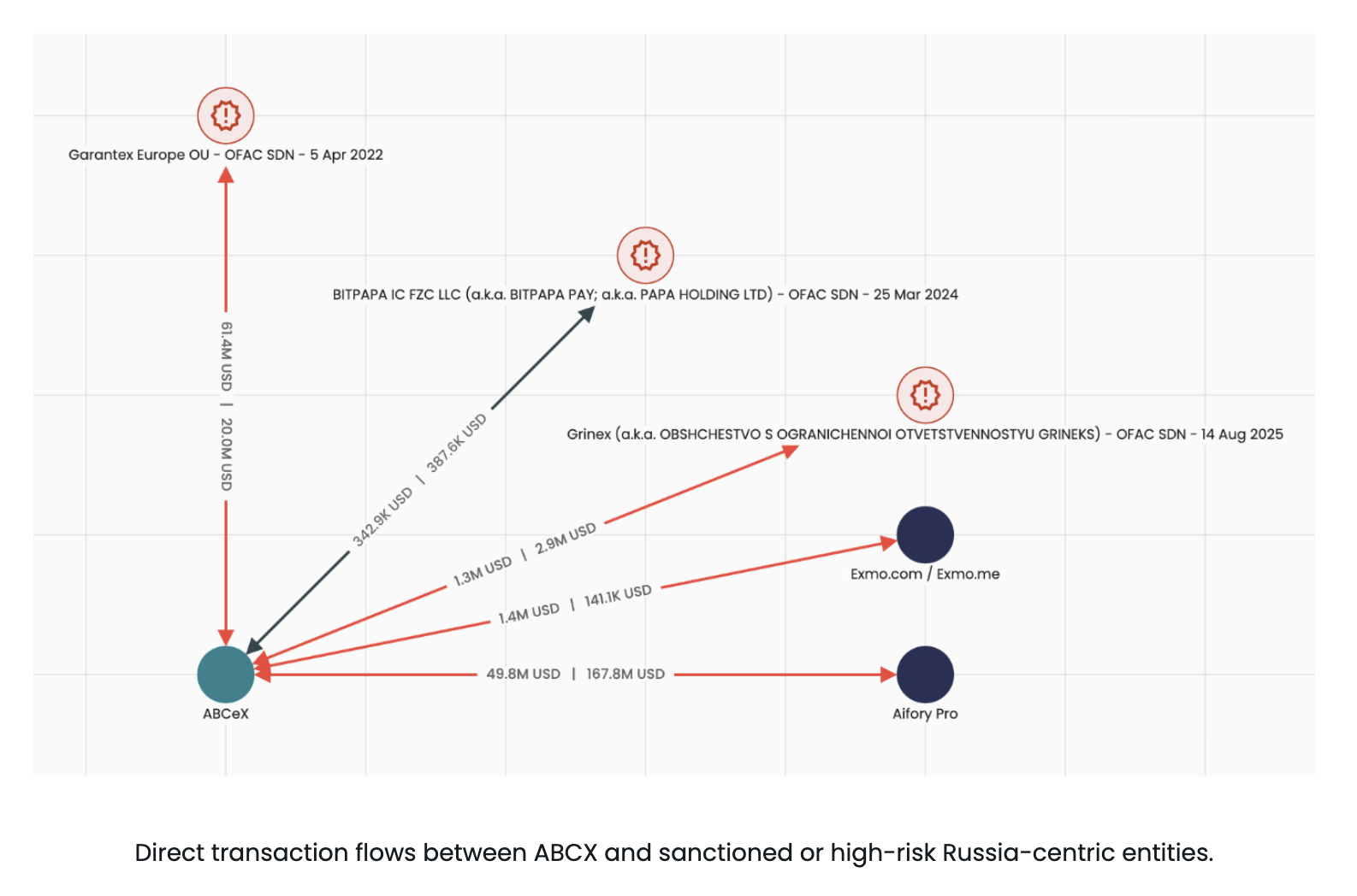 In its analysis, Elliptic singled out five services – Bitpapa, ABCeX, Exmo (Exmo.com and Exmo.me), Rapira and Aifory Pro – arguing they continue to enable sanctions circumvention despite growing regulatory pressure and, in some cases, claimed geographic separation from Russia that on-chain activity does not support.