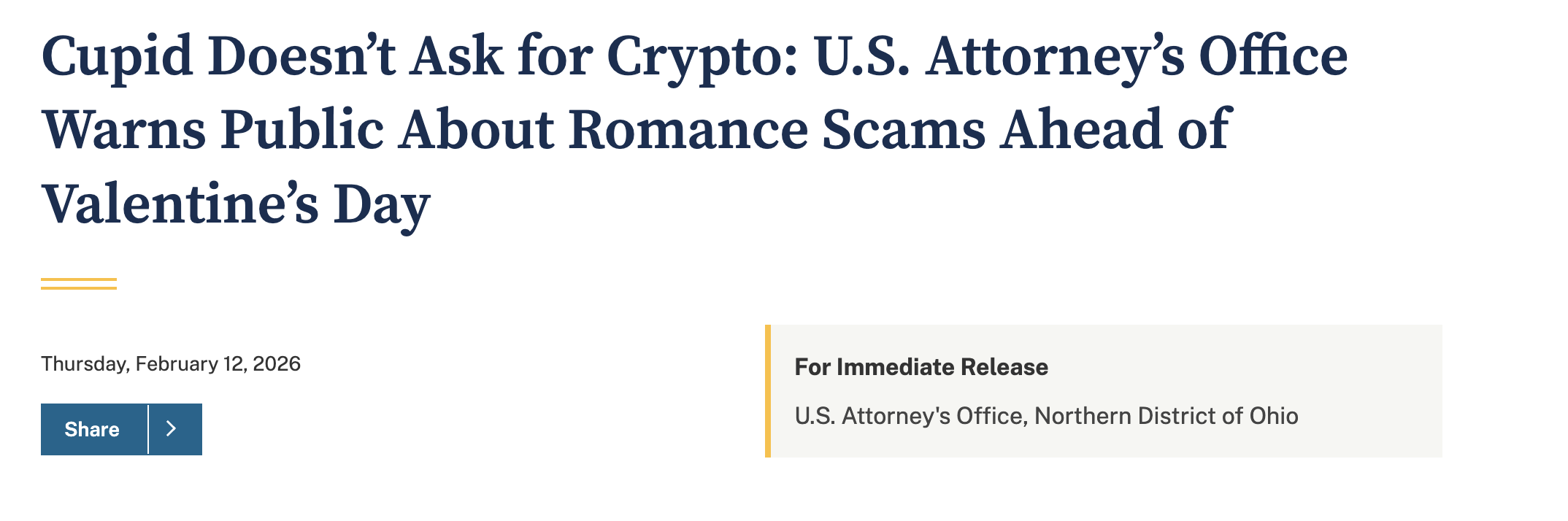The U.S. Department of Justice has warned of an uptick in romance scams tied to cryptocurrency schemes ahead of Valentine’s Day. According to the U.S. Attorney’s Office for the Northern District of Ohio, scammers are using online dating platforms to build long-term emotional engagement before steering conversations toward crypto investments or direct payments in digital assets.