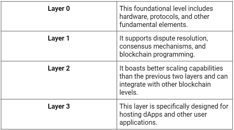 Blockchains use a distinctive authentication method for transactions due to their multi-layered architecture. There are four distinct layers, each with its own set of functions.