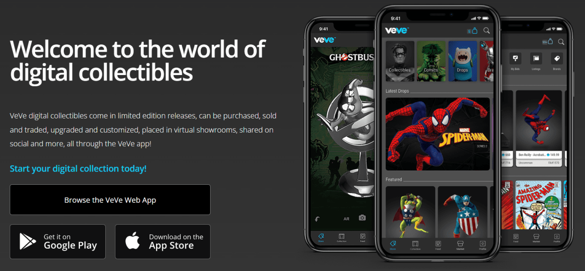VeVe is an app available on smartphones and PCs that has over 500,000 collectible NFTs to buy and sell. The product was launched in 2021. VeVe pairs up with brands like Marvel, Adventure Time, Tokidoki, StarTrek and many others.