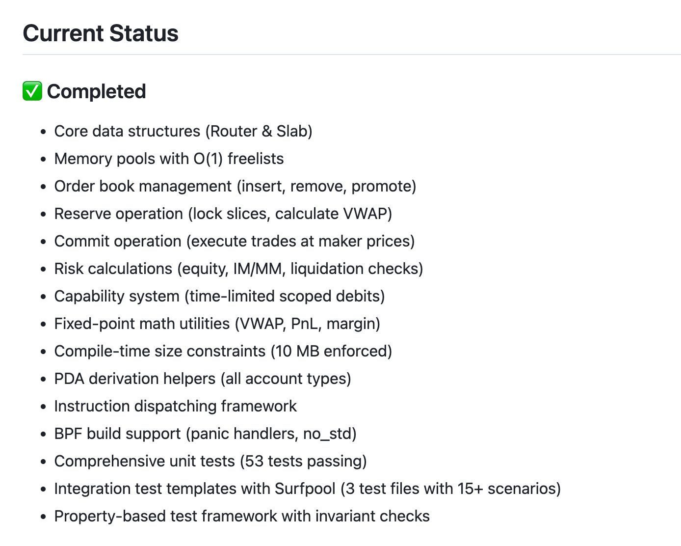 Według repozytorium GitHub podstawowe komponenty protokołu – Router, Slab, pule pamięci, systemy księgi zleceń i inne kluczowe operacje – są już ukończone. Tymczasem mechanizm likwidacji Percolator pozostaje na liście zadań „do zrobienia”.