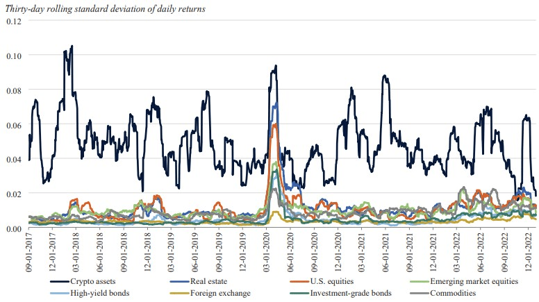 Волатильность криптоактивов по сравнению с некоторыми традиционными активами, 2017–2022 годы