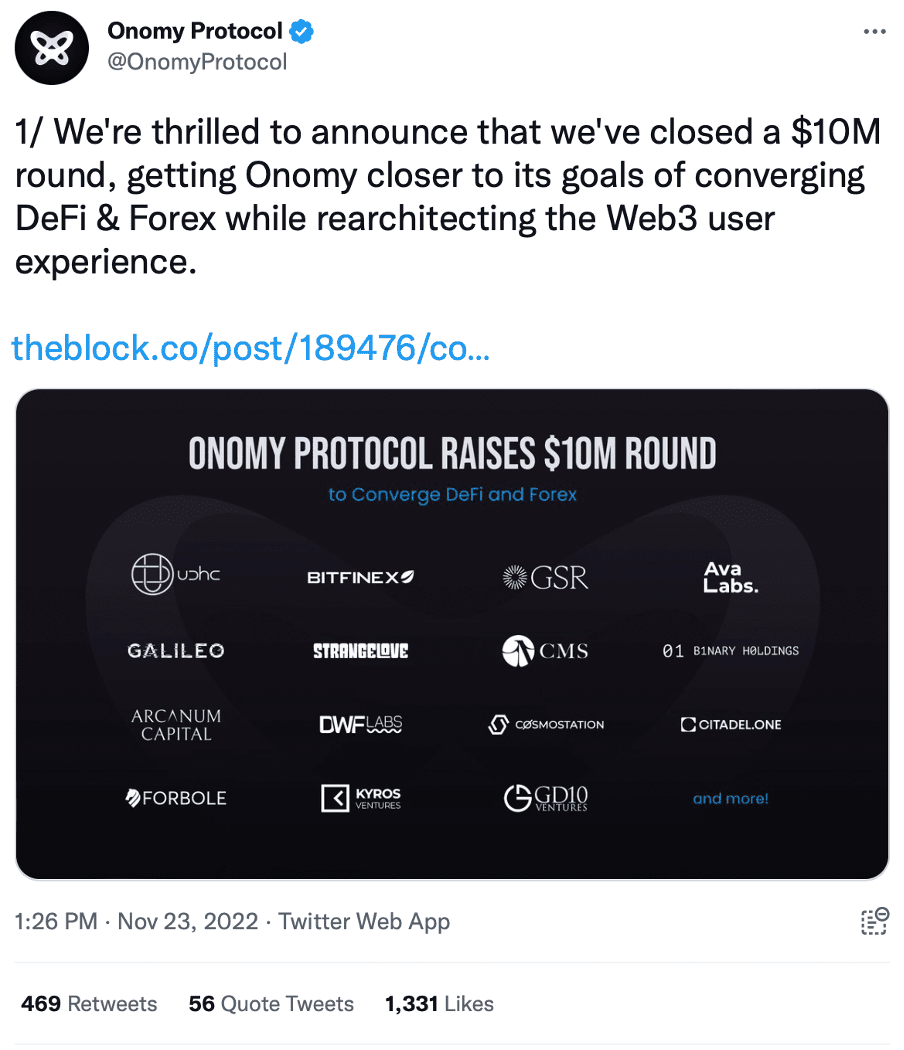 В своих твитах компания объявила, что они « закрыли раунд в размере 10 миллионов долларов, приближая Onomy к достижению своих целей по объединению Defi и Forex, одновременно улучшая опыт использования Web3», подчеркнув, что многие ключевые игроки отрасли являются сторонниками идеи Onomy.