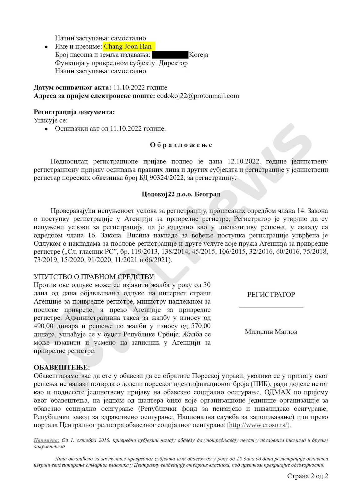 Согласно данным местного Реестра предприятий, Codokoj22 doo Beograd расположена в самом центре Белграда. Сфера деятельности – консультационные услуги, уставной фонд – менее 1 евро. Интересно, что при регистрации компании аферисты использовали свои южнокорейские паспорта. В Реестре предприятий Сербии журналистам пояснили, что никакой информации о красном уведомлении Интерпола у них не было.
