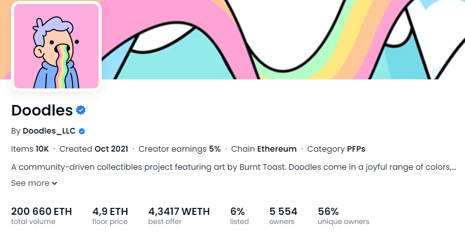 Doodles — 396 000 подписчиков Twitter, 73 000 участников Discord. Кроме NFT-коллекции, они имеют свой магазин с мерчем, коллаборации с другими криптопроектами и как результат — 4,9 ETH — минимальную цену одной NFT.