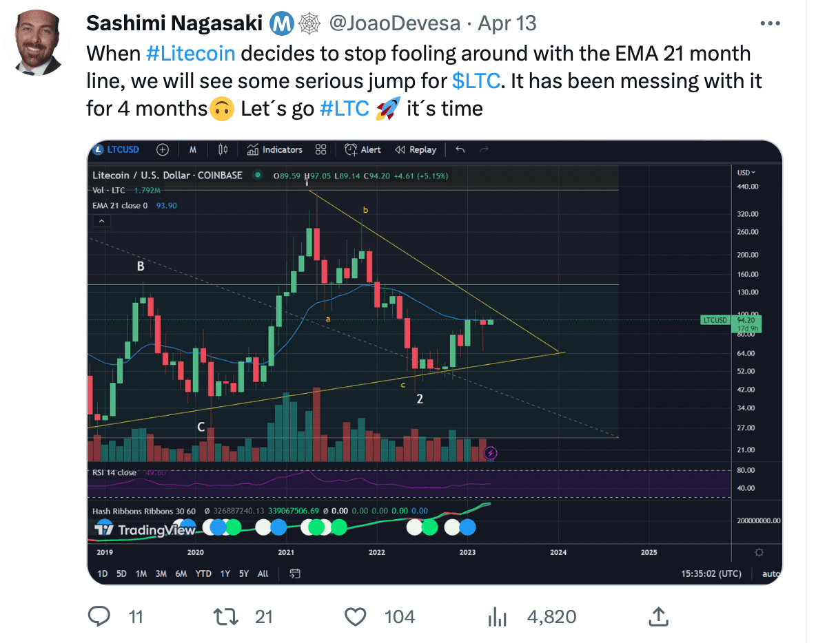 Сашими Нагасаки, который утверждает, что является криптоинвестором с 2017 года, написал в Твиттере: «Когда #Litecoin перестанет играться с индикатором EMA 21, мы увидим серьезный скачок $LTC. Это длится уже 4 месяца ? Давай, #LTC ?, пора!”