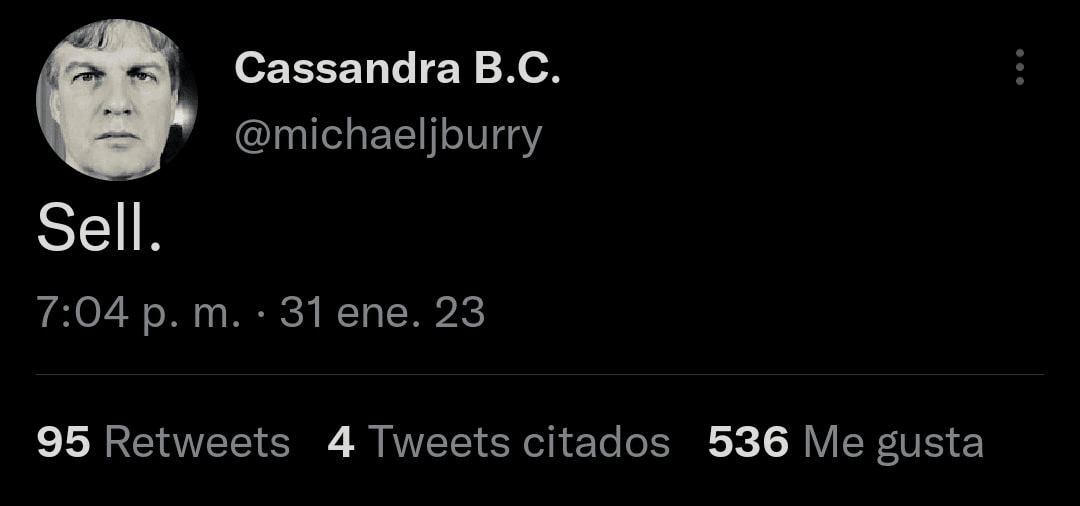 В конце января 2023 года «Кассандра» снова шокировал настрадавшееся криптокомьюнити. Всего за несколько часов до решения ФРС США по процентной ставке Бьюрри твитнул: «Продавайте!» Многие восприняли твит как предупреждение для биткоина, криптовалют и финансового рынка в целом. Но вот незадача — после медвежьего твита Майкла рынок вырос. Бьюрри удаляет аккаунт, а криптоэнтузиасты потешаются над простофилей Майклом. Возможно, в итоге они окажутся правы. Только вот и свои твиты, и свой аккаунт Бьюрри удалял уже неоднократно. А потом возвращался с новыми прогнозами и мешками денег. И что-то нам подсказывает, что легендарный инвестор в очередной раз «вас всех продаст, купит и снова продаст, но уже дороже». (с)