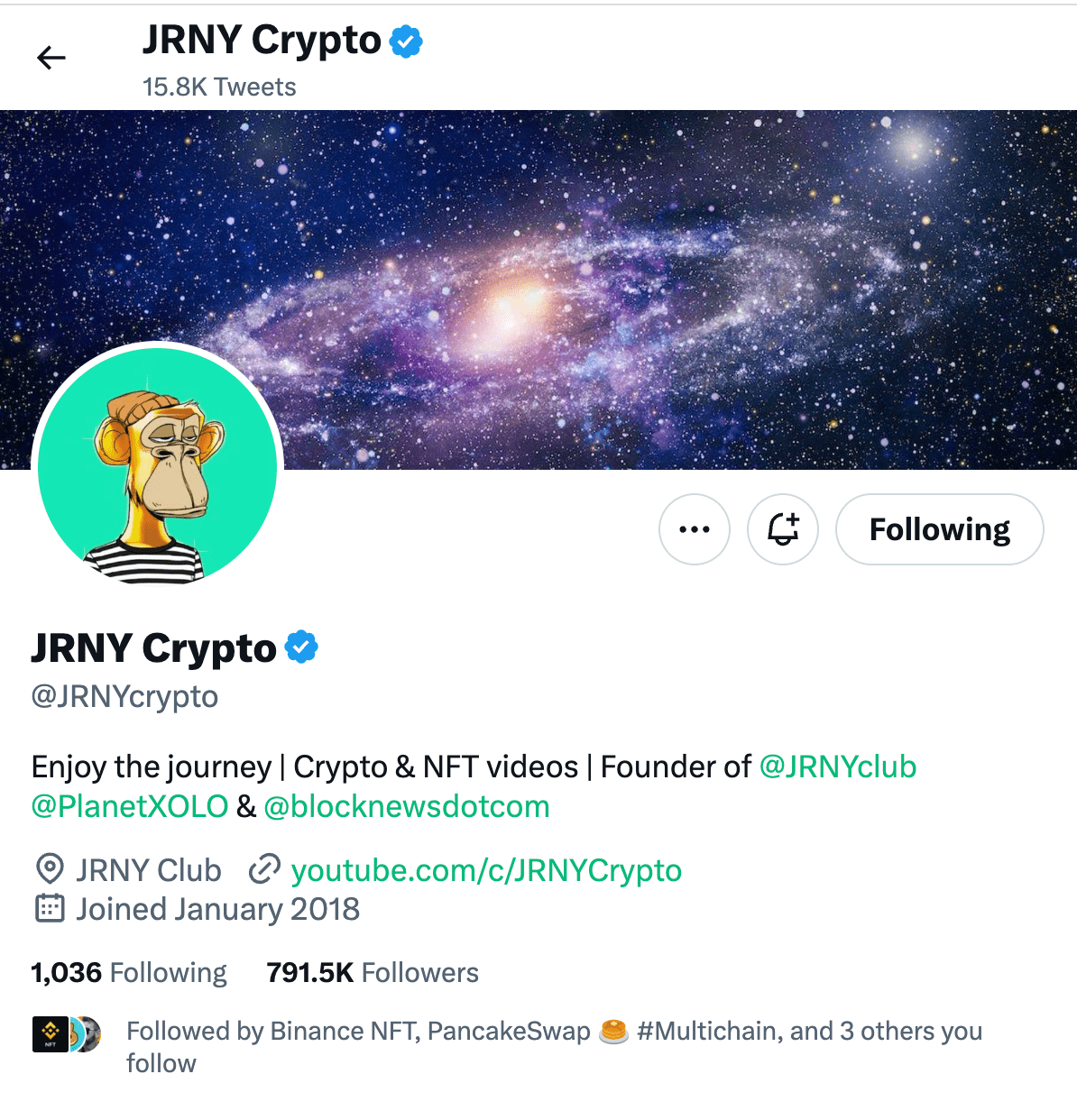 За каналами социальной связи JRNY Crypto — многие следят ежедневно, как за прогнозом погоды. Кроме Twitter c почти 800 тысячами подписчиками, этот инфлюэнсер ведет еще канал на YouTube. И если в твитах он дает краткие экспертные оценки по NFT и метавселенным, то на YouTube представлена подробная аналитика альткоинов.