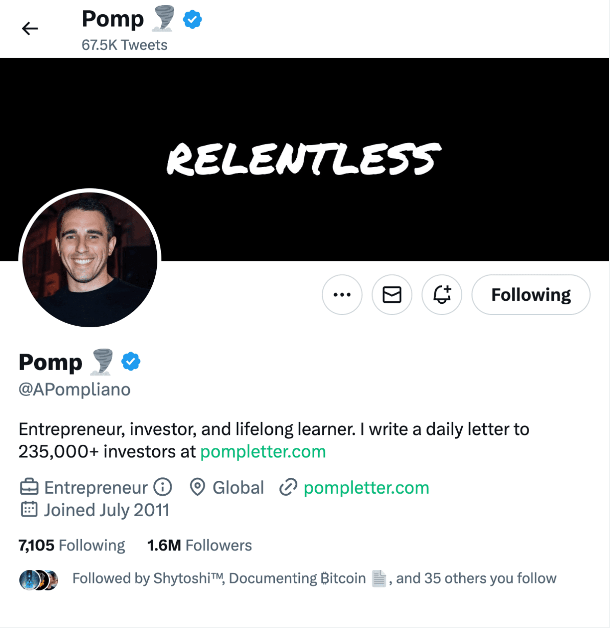 У него 1,4 миллиона подписчиков и он имеет возможности влиять на проекты только за счет того, что его советам следуют тысячи читателей. В своих твитах Помплиано в первую очередь предоставляет информацию о токеномике и инвестициях в разработку технологий.