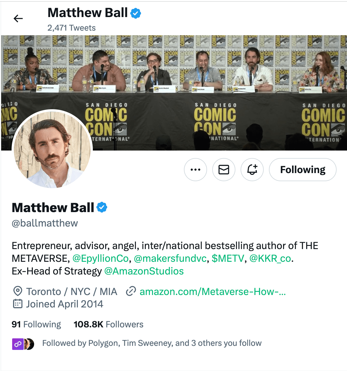 Мэтью Болл не может похвастаться таким количеством подписчиков, как Помплиано: его твиты читают чуть больше 100 тысяч человек. Аудитория Мэтью — это разработчики, дизайнеры, специалисты по искусственному интеллекту и футурологи. Болл — стратег, эссеист, инвестор, консультант и автор статей для технологических изданий. Он является управляющим партнером компании Epyllion, которая контролирует венчурный фонд, является консультантом для институциональных вкладчиков и входит в совет директоров компании. У него более 100 тысяч подписчиков в Twitter.