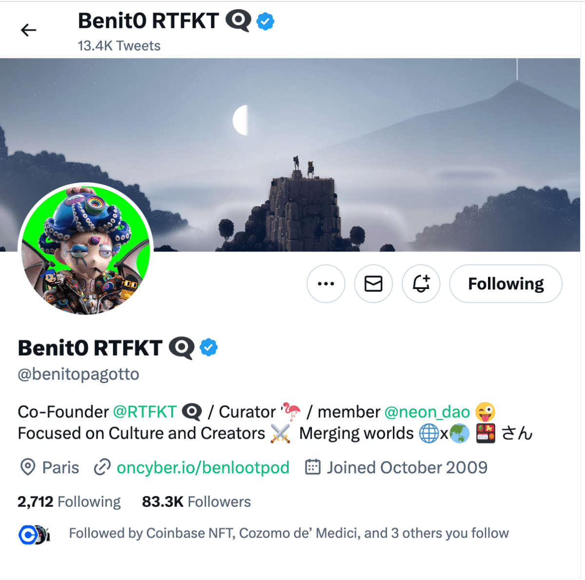 У этого ЛОМа немного больше 80 тысяч фолловеров, но очень активное комьюнити. Кроме того, на него подписаны все популярные инфлюэнсеры в области NFT. Бенитто — законодатель моды и гениальный дизайнер, который умеет создавать трендовые подборки для коллекционеров. Не зря в его платформу RTFKT инвестировал $8 млн крупнейший венчурный фонд Andreessen Horowitz.