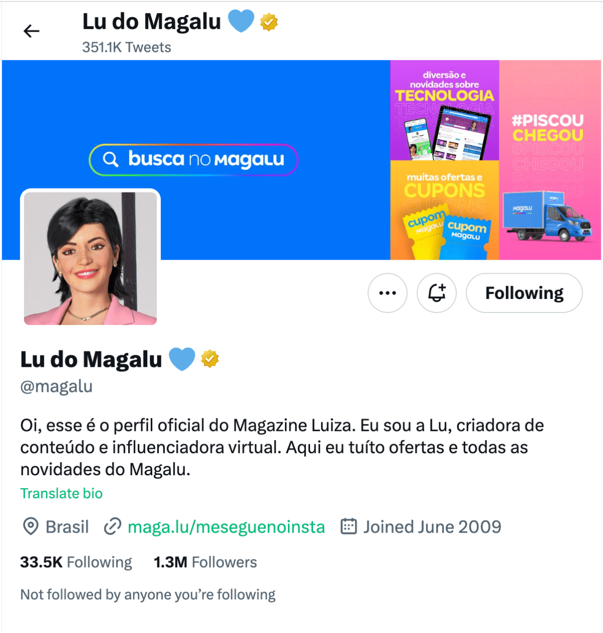 Никогда не стареющая Лу до Магалу — самый влиятельный виртуальный персонаж в Бразилии. Она — лицо розничного гиганта Magalu, известна с 2009 года. Но ее интересы и темы, которые она поднимает, давно вышли за пределы Латинской Америки. У нее более 14 млн подписчиков в Facebook, около 5 млн подписчиков в Instagram, более 2 млн подписчиков на YouTube и более 1 млн подписчиков в Twitter и TikTok соответственно.