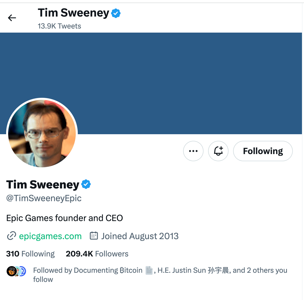 Тим Суини — основатель и генеральный директор Epic Games, создавший популярную видеоигру Fortnite. Он считает, что Metaverse — это прекрасная инвестиция, которая в будущем позволит снимать сливки с триллионных капитализаций проектов. Имеет более 200 тысяч подписчиков.