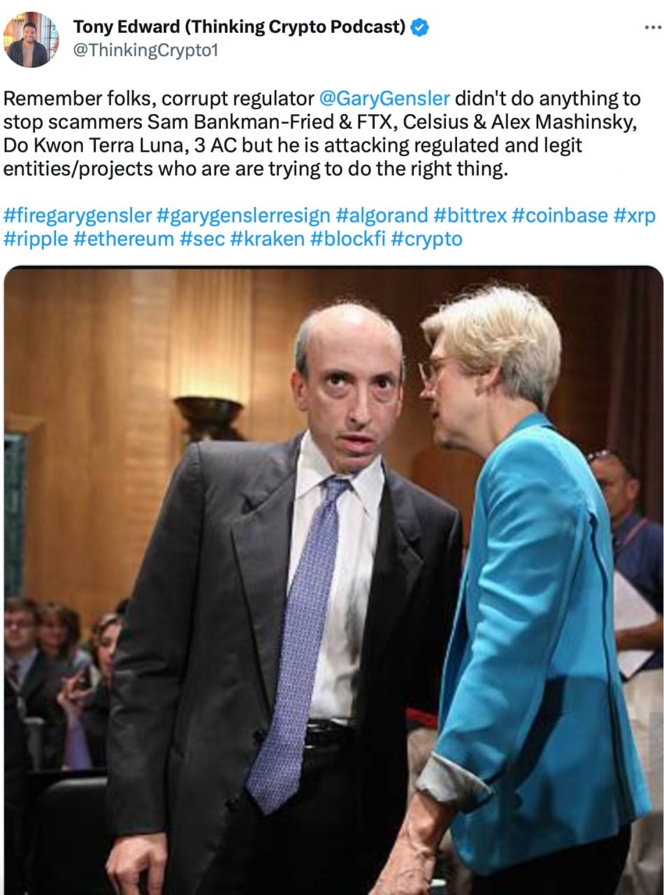 Такі дії призвели до бурхливої реакції криптоспільноти у твітері — її представники запустили хештег #FireGaryGensler. Дописи, розміщені під цим хештегом, належать різним шанувальникам криптосфери. Тоні Едвард, автор подкасту Thinking Crypto, — один із найгучніших коментаторів.