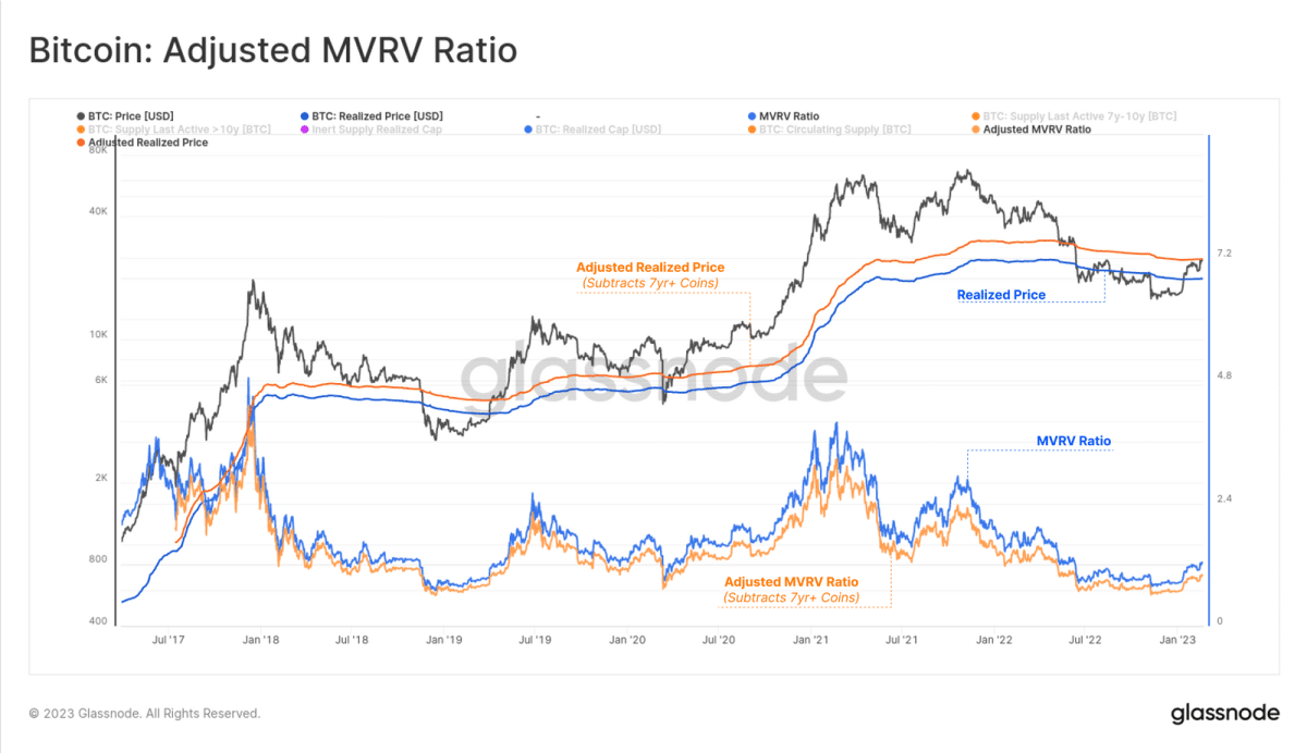 На графіку показаний скоригований MVRV, що віднімає нереалізований прибуток, який створився через монети, що тривалий час не були в обігу. Зрештою ми маємо скориговану ціну реалізації і вона є вищою, але точніше відображає середню ціну придбання монет. Це, у свою чергу, знижує коефіцієнт MVRV і забезпечує більш точний аналіз пропозиції ліквідних та мобільних монет.