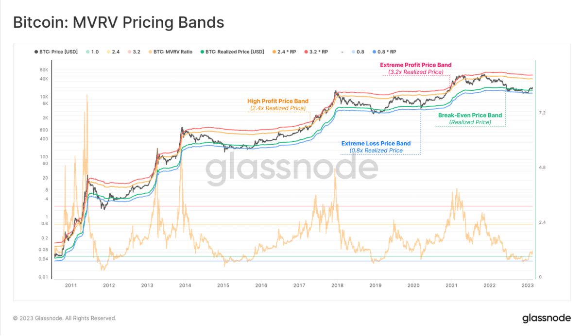 - Якщо MVRV дорівнює 0,5 — це означає, що ціна в 0,5 раза нижча від ціни реалізації, а інвестори в середньому зазнають збитків -50%.