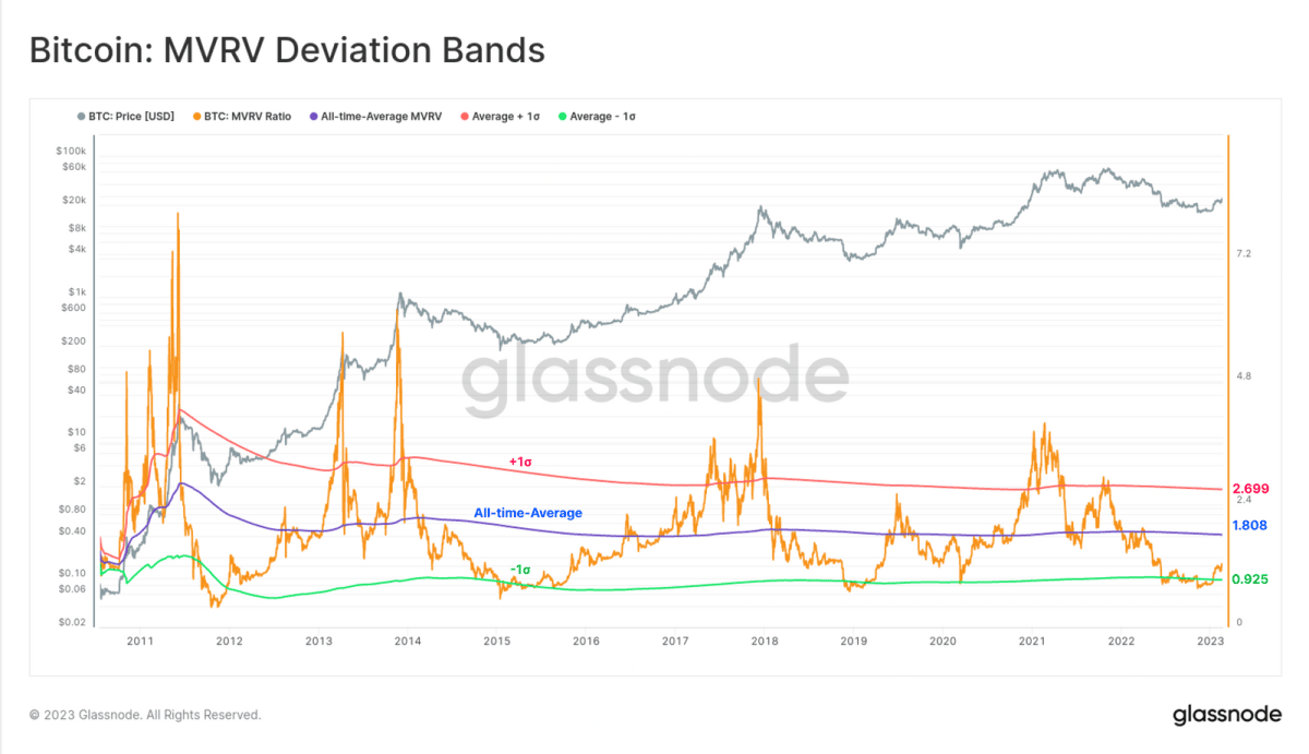 Якщо розрахувати середнє значення MVRV протягом усього часу і використовувати діапазон одного стандартного відхилення, це дає більш точне розуміння екстремальних значень коефіцієнта.