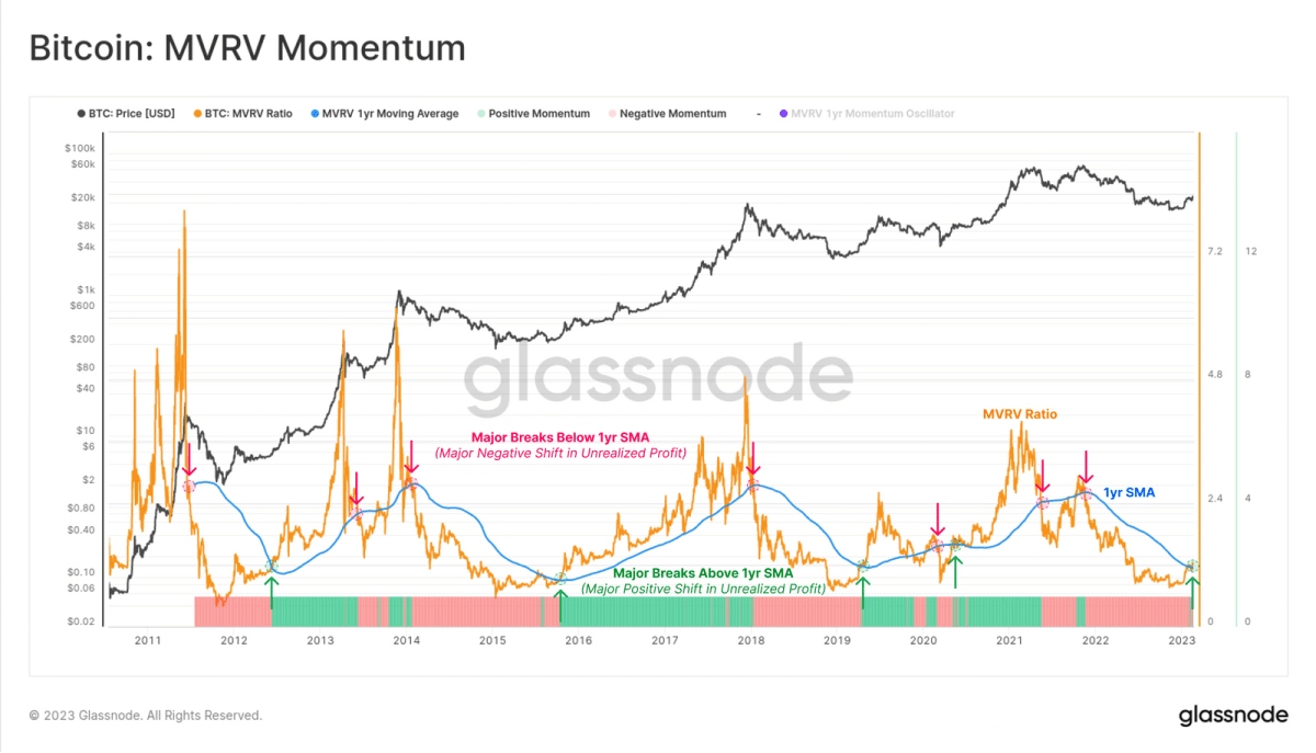 На графіку наведені MVRV разом з простою ковзною середньою впродовж 1 року. Можна виділити періоди, коли MVRV торгується вище 1-річної SMA і це відповідає бичачому ринку, а коли нижче — ведмежому.