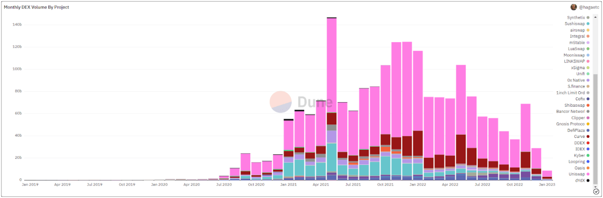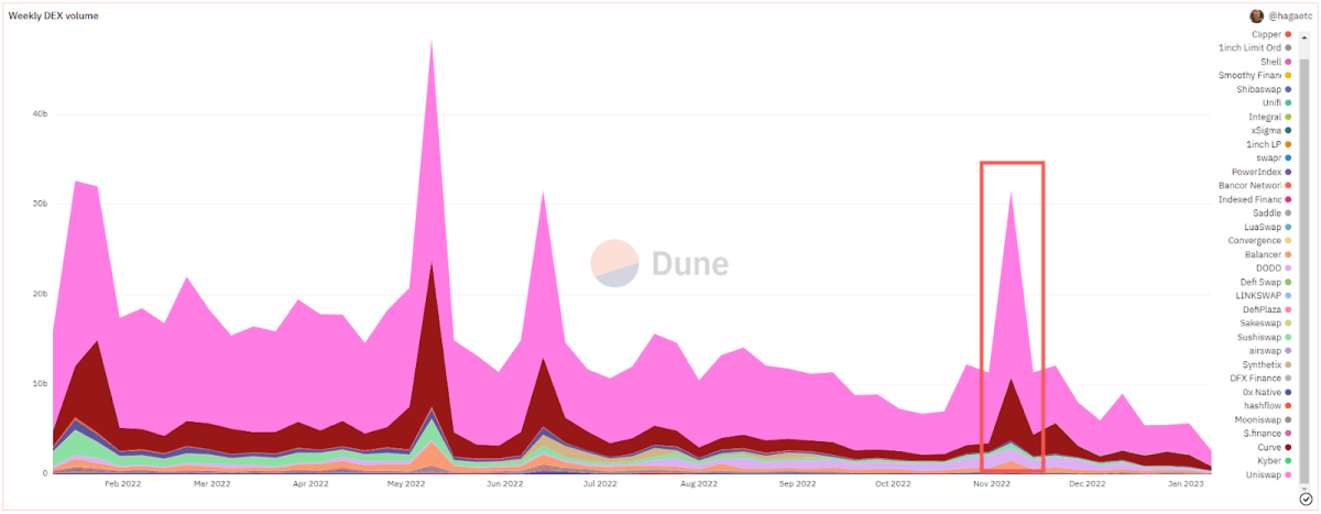 Звичайно, обсяг може коливатися в залежності від ринкових циклів або колапсів на криптовалютному ринку. Наприклад, під час краху FTX обсяги торгів на DEX зросли майже вдвічі. У листопаді вони становили $65 млрд, що на 93% більше, ніж у попередньому місяці. Пояснюється це тим, що падіння найбільшої централізованої біржі викликало занепокоєння інвесторів щодо надійності зберігання своїх активів. Тому вони почали масово переходити на децентралізовані платформи, які дозволяють їм самостійно зберігати свої ключі.