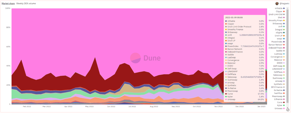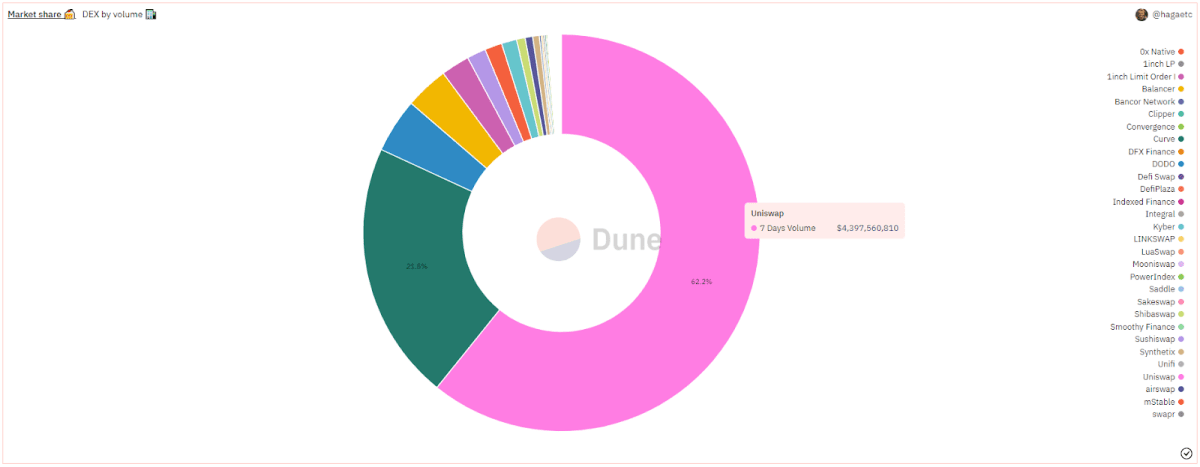 Платформа Uniswap вже довгий час займає домінуючу позицію і її частка ринку набагато вища, ніж у інших платформ.