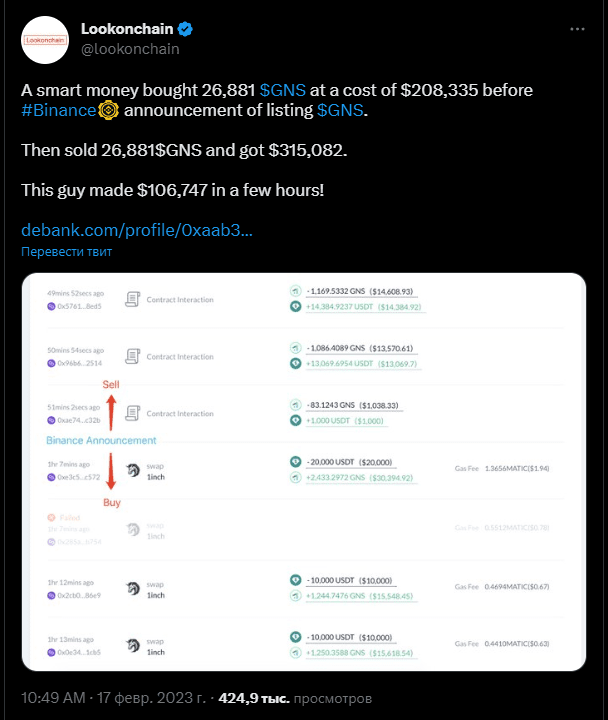 Останній випадок можливої інсайдерської торгівлі трапився 17 лютого. Його виявив популярний аналітичний сервіс Lookonchain. У цей день біржа Binance оголосила про проведення лістингу токена GNS. За декілька годин до анонсу лістингу трейдер почав набирати позицію по GNS, а одразу ж після лістингу позбувся ії, заробивши на цьому $ 100 тисяч менше ніж за 1 годину.