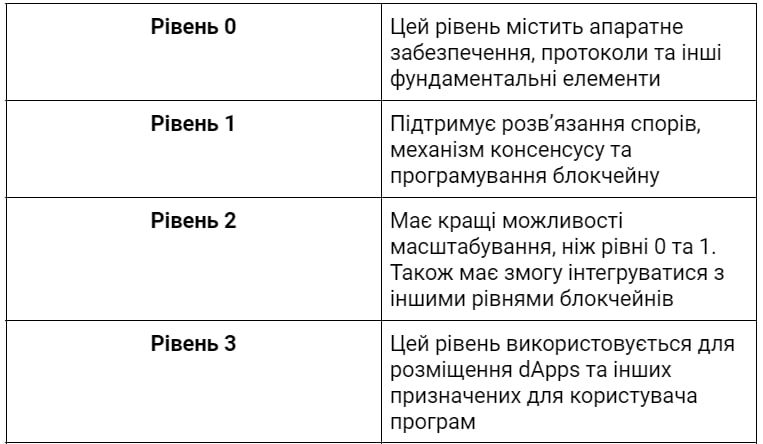 Блокчейни використовують унікальний метод аутентифікації транзакцій завдяки своїй багаторівневій архітектурі. Існують чотири рівні, кожен з яких має власний набір функцій.