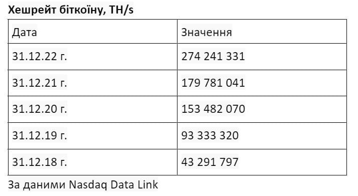 Як ми вже сказали, швидкість хешування вимірюється у хешах за секунду (H/s). У травні 2011 року хешрейт біткоїна вперше досяг швидкості в 1 трильйон хешів за секунду (1 TH/s). З тих пір цей показник незмінно зростав, і на початок 2023 року наблизився до 275 млрд TH/s.